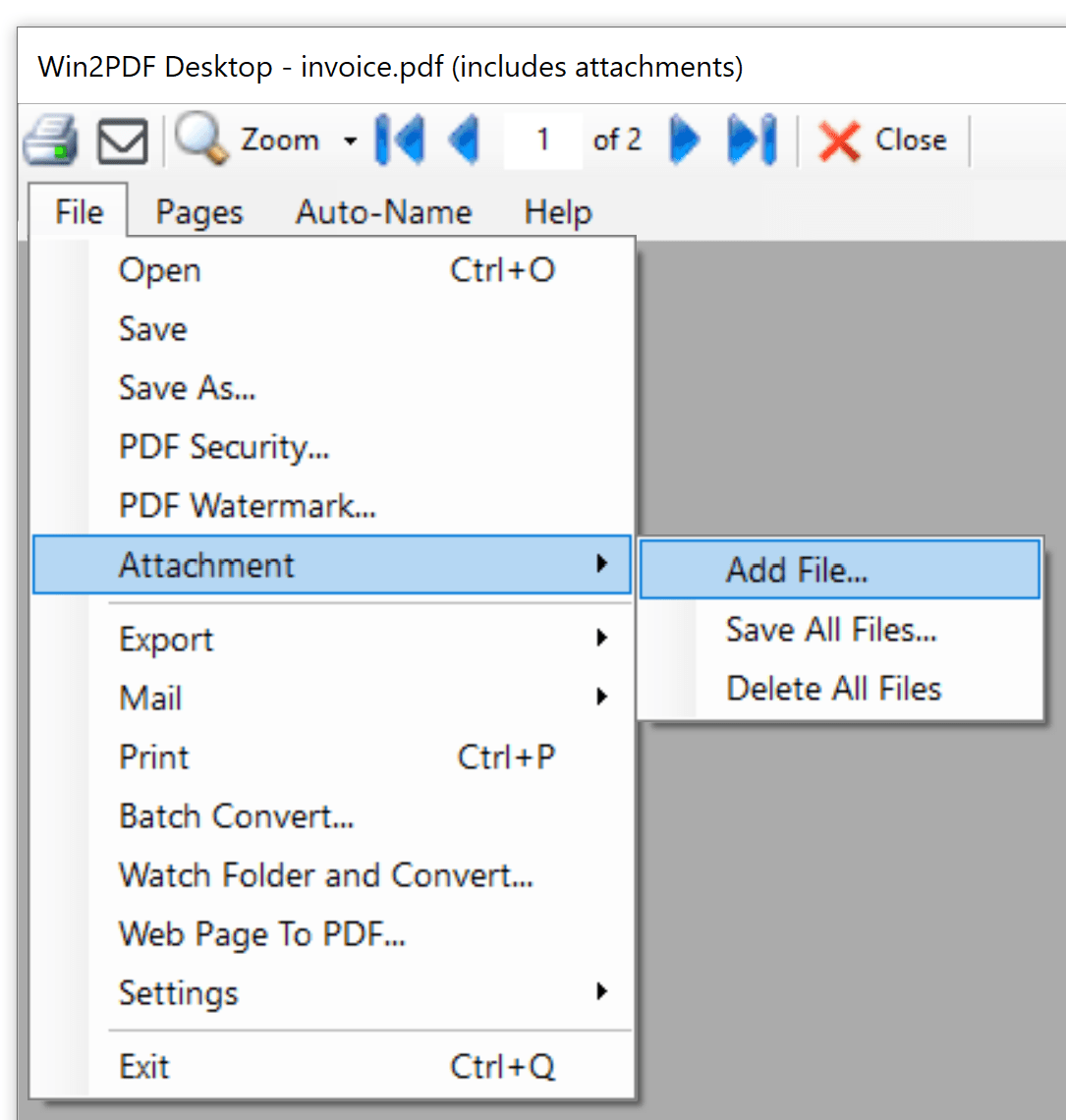 To add a shared file attachment to the open PDF, select "Add File..." from the "Attachment" menu.